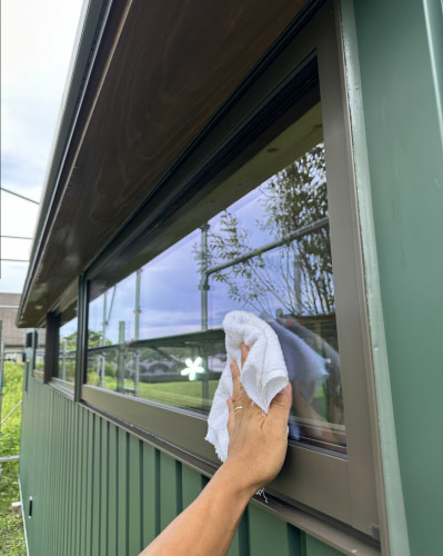 足場が無くなると簡単に手が届かなくなる場所は特に入念に洗います。 しっかり流すと最後は拭き上げです。