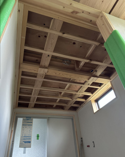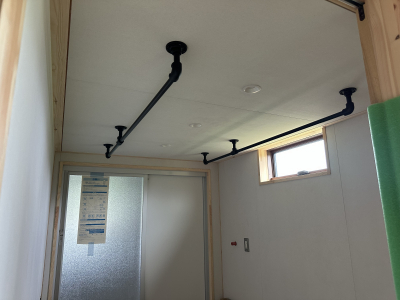 先ずは天井の下地組みからスタート。 室内干し用パイプなど負荷の掛かる部分にはしっかりと補強を行います。