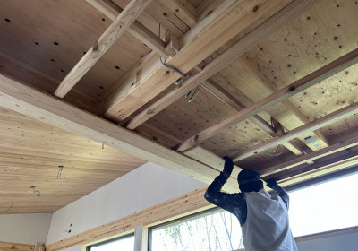 内部に入ると柱と梁などを接合する金物の確認や床合板の状態などを検査します。