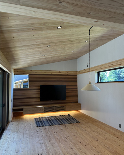 レッドシダーのアクセント壁と ホワイトアッシュ材を使ったテレビボードが リビングに高級感と癒しをば。