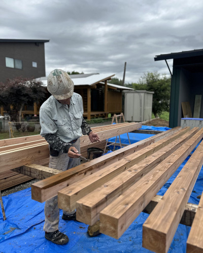 外部でも並行して工事は進みます。 デッキや板塀で使う材料も現地で1枚・1本ずつ丁寧に塗装。