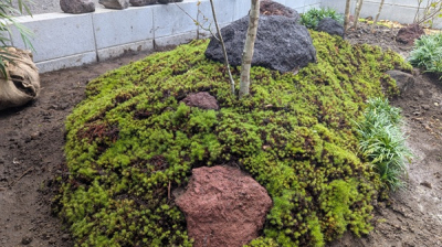 美しい「苔」の山脈を手作業で植えていきますと、何時しか眼前には霧島の山並が広がるのでした。