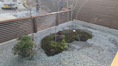 夕方、砂利を敷き詰めましてかわいいお庭の完成です。
