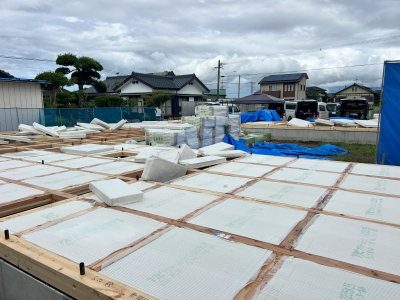 碁盤の目状に敷き込まれた土台間には断熱材を隙間なく設置します。