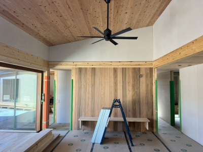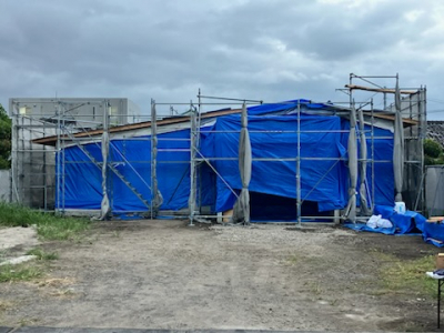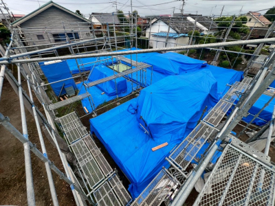 建物全体を厚手のシートで隅々まで丁寧にラッピングし、 お家の内部も雨風対策を施し建て方工事の完了です!