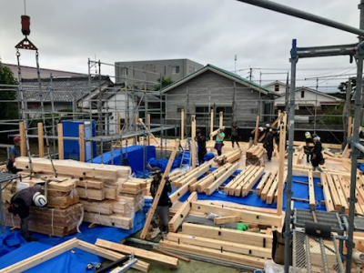 上棟にむけた下準備として配置された材料が雨や夜露対策を施され整理整頓された状態で出番をまちます。
