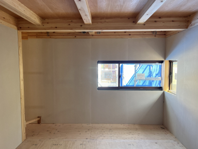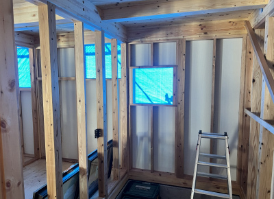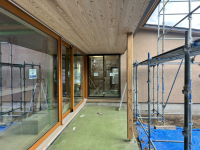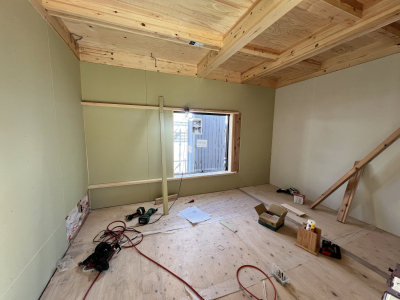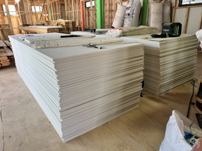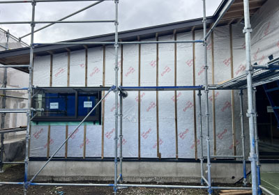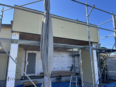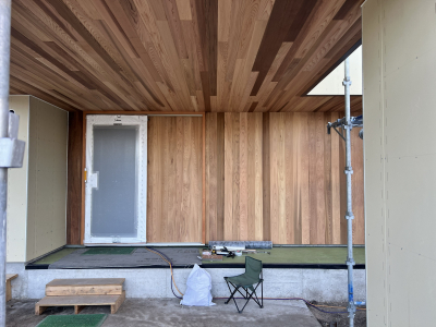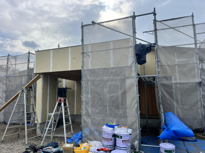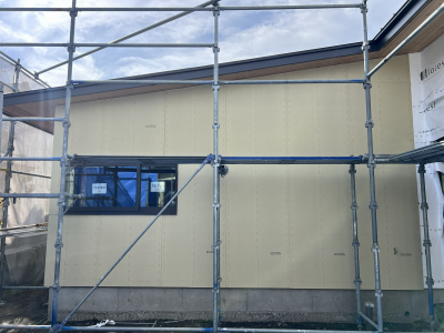 外部では塗壁下地用のボード張りを行いました。
