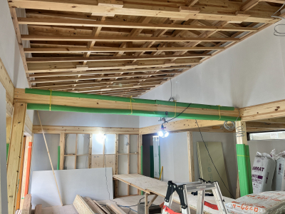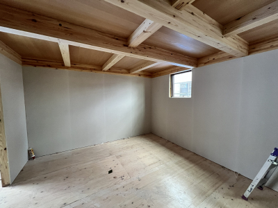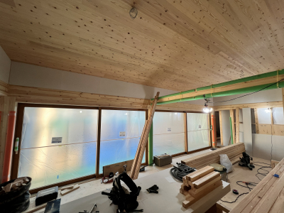内部では吹き抜け天井の仕上げへと着手。