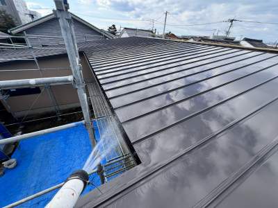 雨樋の流れもチェックして、屋根の洗浄を終えます。