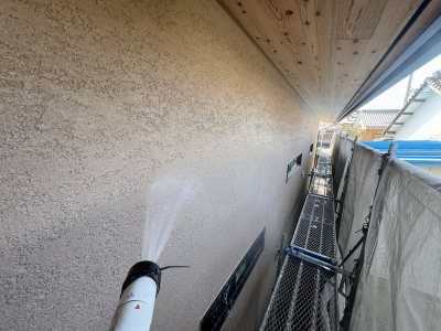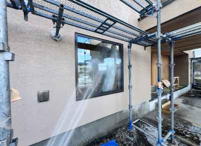 施工してすぐの塗り壁面もしっかりと洗い流していきます。