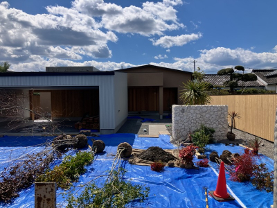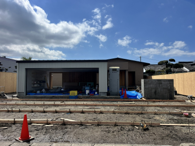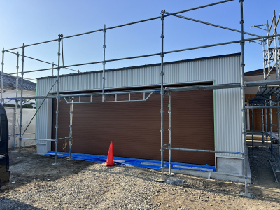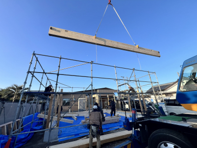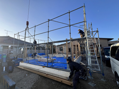 今回は”別棟”ガレージの建て方工事を行いました! 快晴の建て方日和。