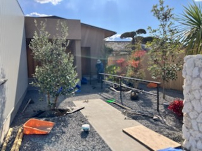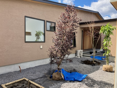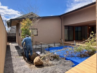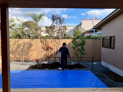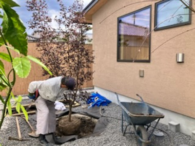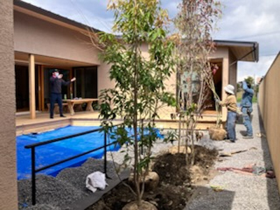 順調に工事がすすむ現場は彩りをそえる植栽工事に突入しました。