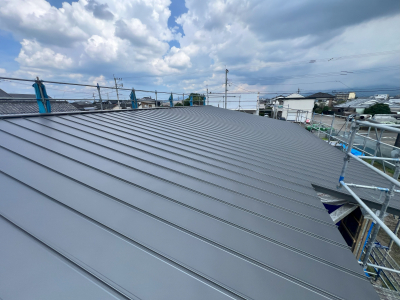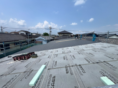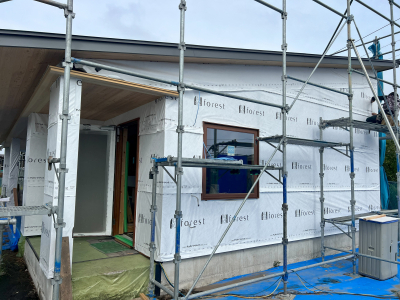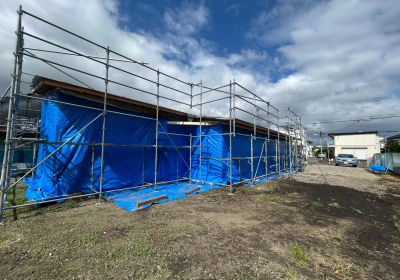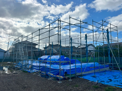建物全体をブルーシートで丁寧に包み、建て方工事完了です!