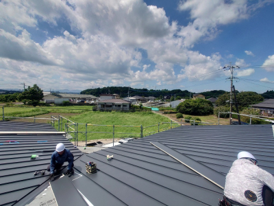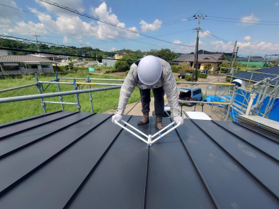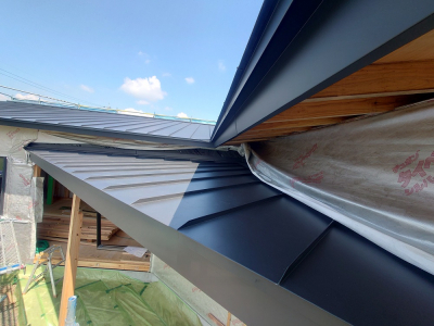 建物の最上部ではガルバリウム鋼板の屋根工事が行われました☀