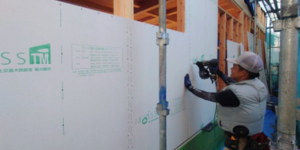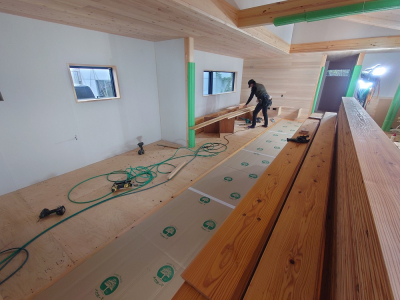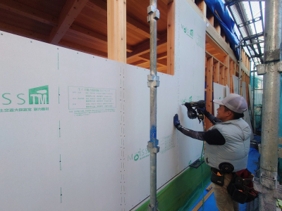 現場「gree N times」では屋根工事と並行して外部内部の耐力面材施工を行いました。