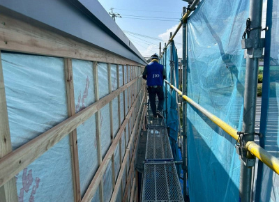 そして、屋根工事等の主要な雨仕舞工事、耐力面材施工が完了したところで第三者機関JIOによる構造検査が行われました。 JIOによる検査は基礎工事時の配筋検査に続き2回目です。