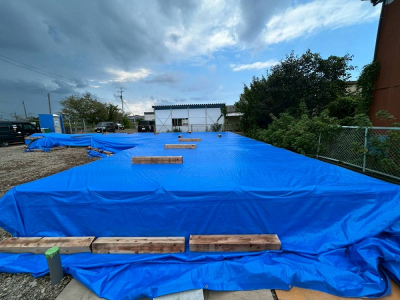 さらに念には念を。その上から厚手のブルーシートでラッピングを行い2重の雨養生です。
