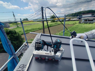 屋根葺き専用の機械を駆使して円滑に工事が進みます。