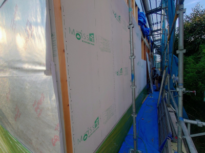 建物外周面の耐力面材施工状況。
