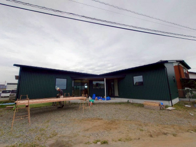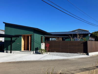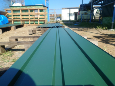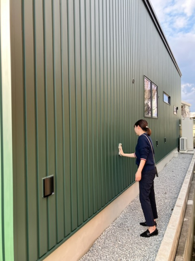 仕上げ材は緑色の角波でマットな質感のガルバリウム鋼板です。