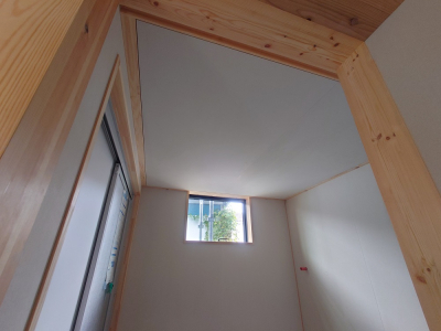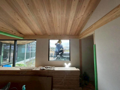 写真は内部モイス施工後に行われた天井仕上げの様子です。