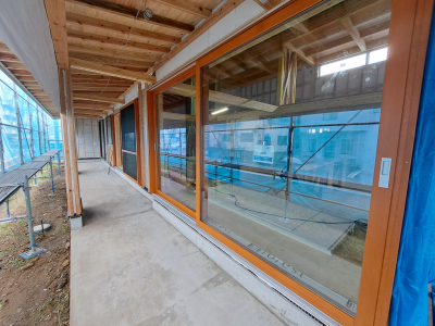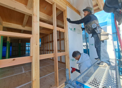 着々と工事が進む中、まずは耐力面材の施工を行います。
