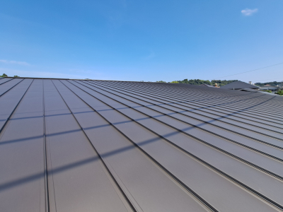 今回、採用してます次世代ガルバリウム鋼板の立平葺き納め。
