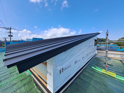 板金屋さんによるガルバリウム鋼板の屋根工事も着々と進んでおります。