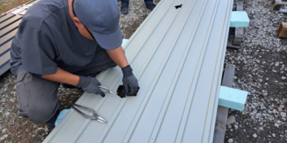 ガルバリウム鋼板の施工は一枚ずつ採寸から加工~取付まですべてを現場で行います。