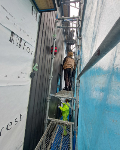 このあと、防水処理・軒天塗装など経て足場の解体へと進みます。 建物全貌が見れる日が楽しみです。