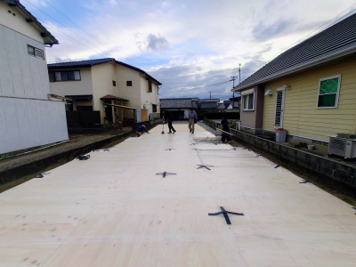 仕上げに雨養生の為の保護シートを床パネルに貼ります。