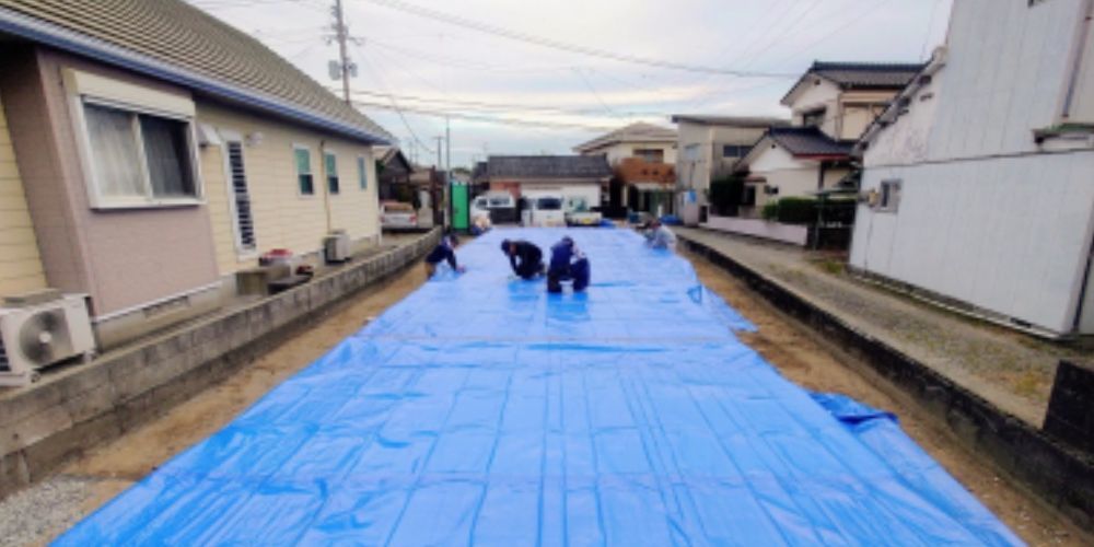 さらにその上から厚手のシートでラッピングをして2重の雨養生。