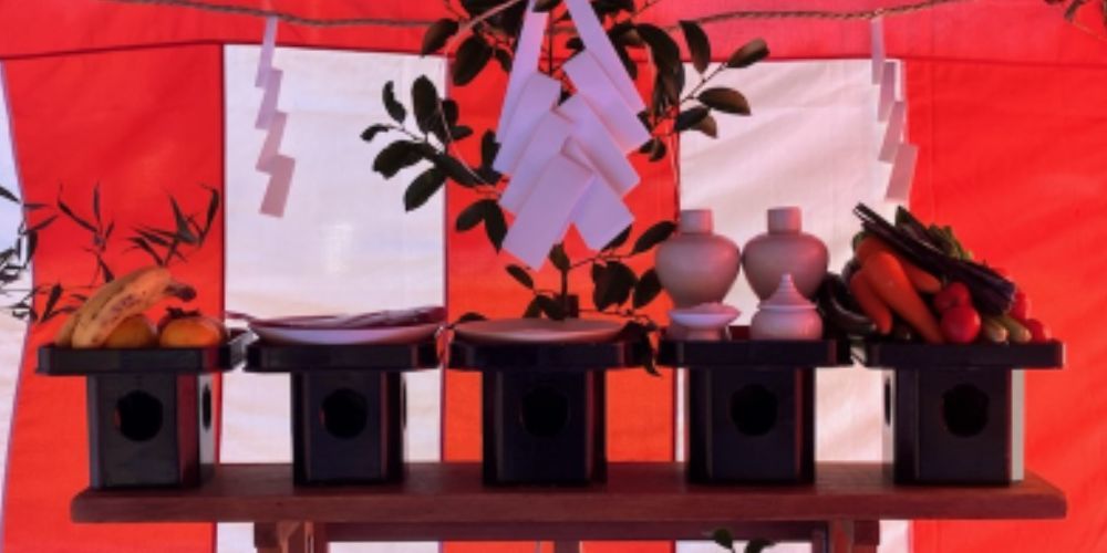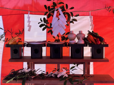 立派な鯛や果物、この季節ならではの色とりどりのお野菜がおそなえされ地鎮祭の準備がととのいました。