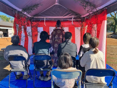 日本ならではの伝統的な風習で、神主様を招いて神様へご挨拶し土地を清める事で工事の無事を願います。