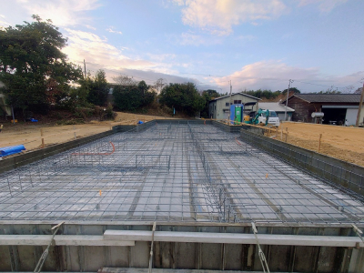 基準コンクリートを打設後、鉄筋組みを行います。