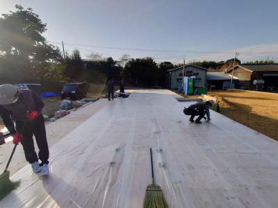 午後から構造用の床パネルを設置したら、表面を覆うように透明の保護シートは貼ります。