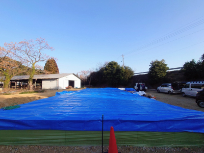厚手のブルーシートを被せて二重の雨養生です。