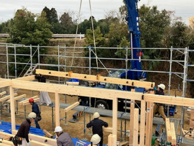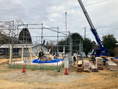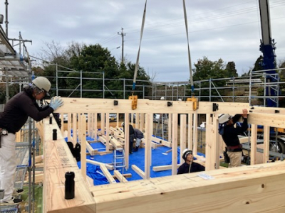 全国的に冷え込みが厳しい季節柄の上棟日となりましたが、 透き通った青い空が気持ちのいい建て方にはもってこいの日となりました。