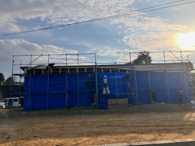 屋根は防水シートで 雨仕舞い、壁は厚手のシートでラッピング養生し雨風対策もバッチリです!