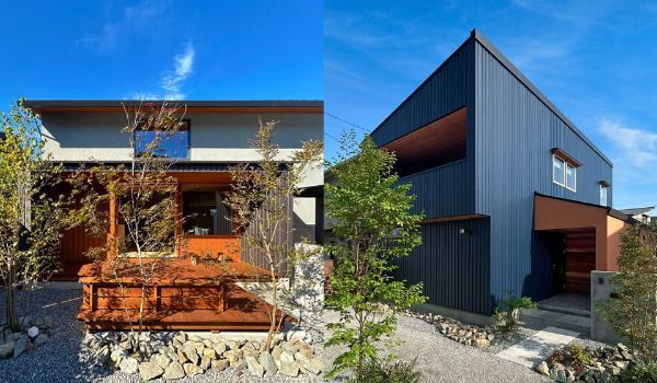 直線的なガルバリウム外壁と表情豊かな塗り壁のコントラスト。隣接する2棟の木の家をご覧頂けます。
