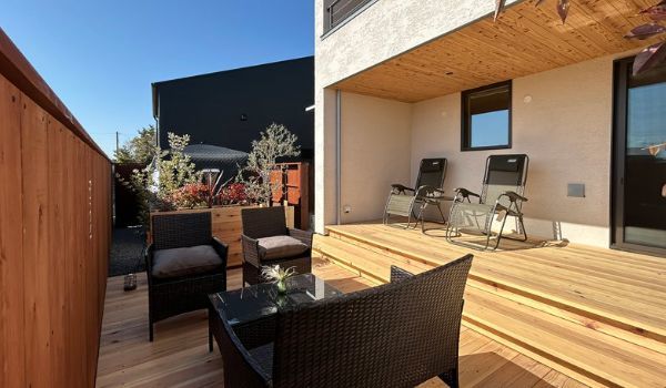 ウッドフェンスで囲われた1Fのテラスから、広がる青空。