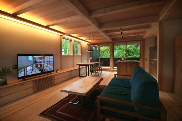 直線を意識したプランニングで、その先に広がる緑の景色がより一層引き立ちます。壁際のTVボード兼ベンチは収納スペースにも。
