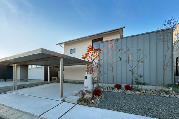 淡いトーンの外観に寄り添う樹木が、洗練された雰囲気を感じるアプローチ。通りに開きながら、玄関部分のプライバシーを確保します。
